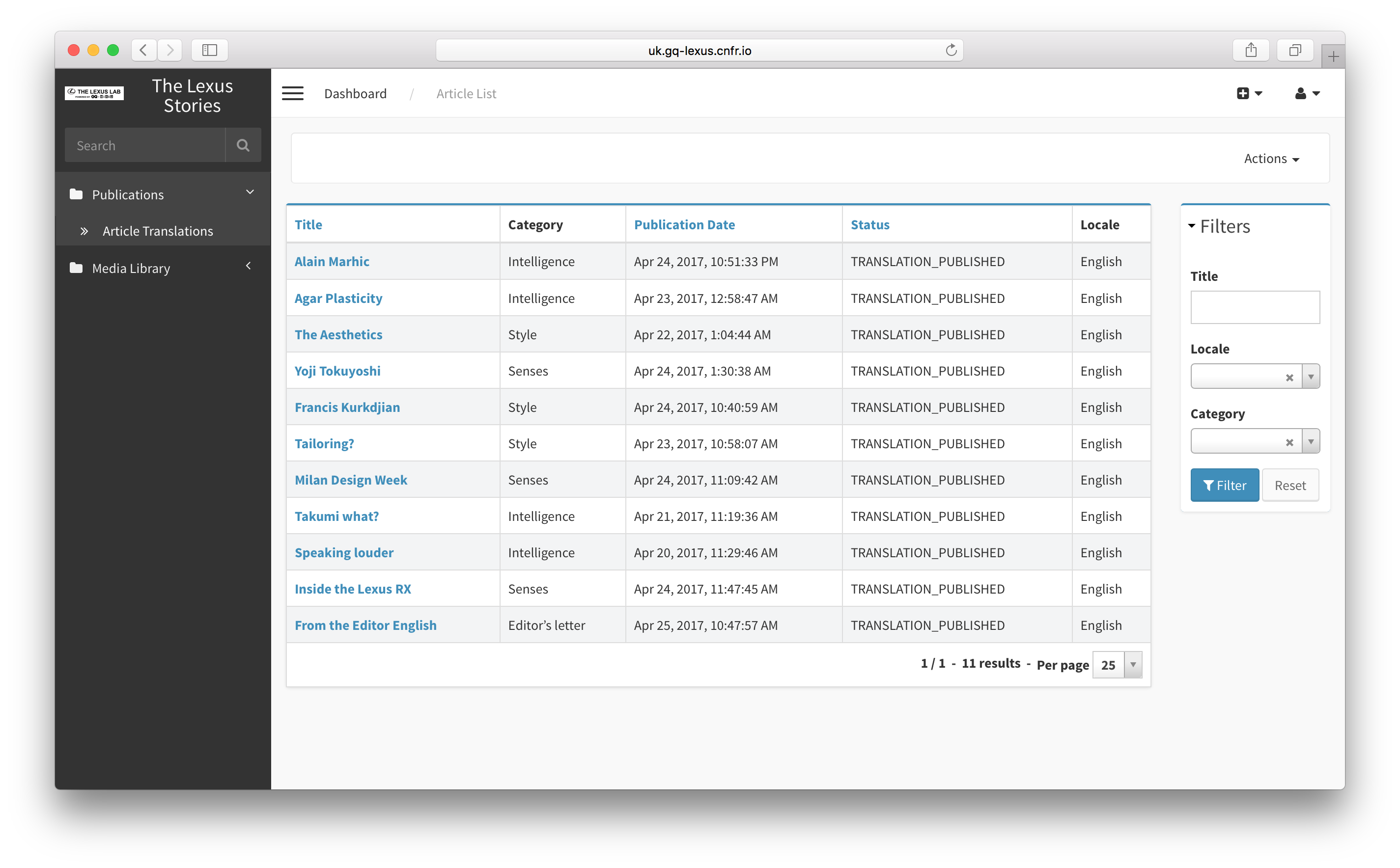 - Article Translations: List of content featured in all sections