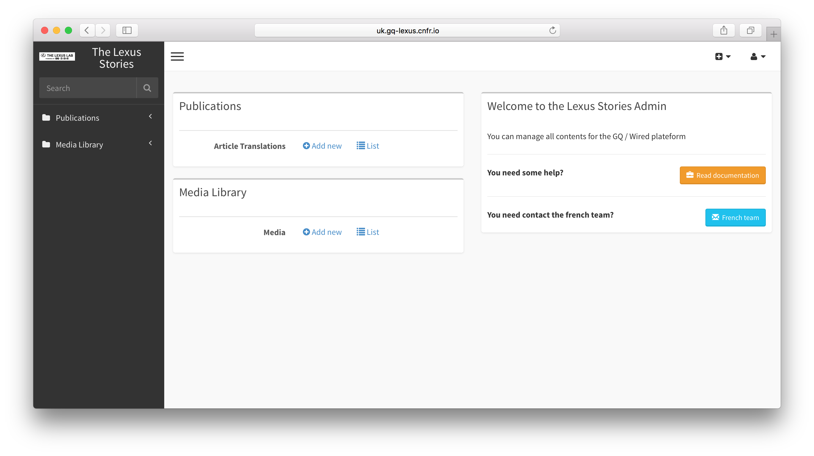 - Welcome Section: Information on how to contact the GQ France team and access the online documentation.